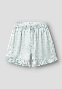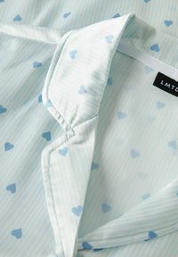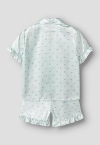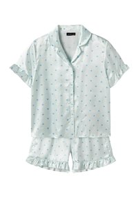 Haut de pyjama bleu clair à manches courtes avec boutons et short assorti avec petits motifs de cœurs bleus et bords à volants sur les manches et le short.