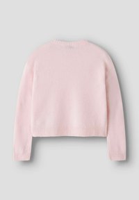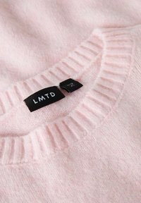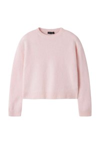 Pull rose clair à manches longues avec col rond, poignets, ourlet et encolure côtelés, présenté sur un fond blanc.