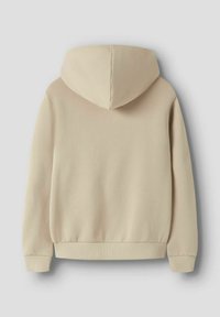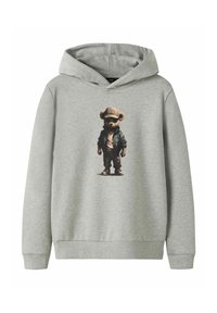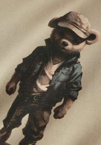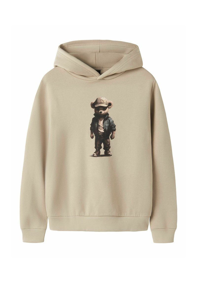 Sweat à capuche beige avec un graphique d'un ours portant une casquette, une veste, un pantalon et des baskets, positionné au centre à l'avant.