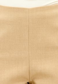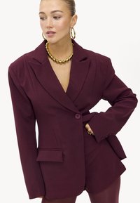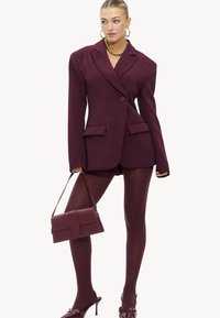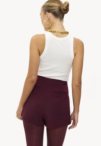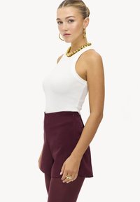 Débardeur blanc à côtes, short taille haute bordeaux, collier chunky doré et boucles d'oreilles. Le mannequin pose les mains sur les hanches.