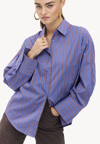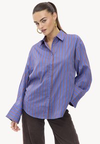 Chemise à rayures bleues avec des lignes verticales orange, à boutonnage sur le devant et à manches longues. Fabriquée en tissu lisse, elle présente une coupe décontractée.
