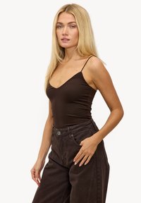 Femme blonde portant un débardeur à fines bretelles marron foncé et un jean marron foncé ample, une main dans la poche.