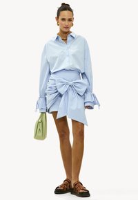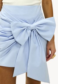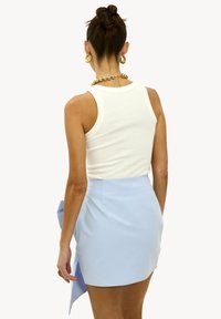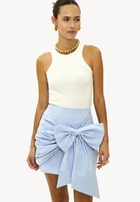 Débardeur blanc côtelé associé à une mini-jupe bleu clair avec un grand nœud et un tissu froncé pour ajouter de la texture et de la forme.