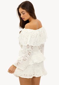 Femme en robe blanche à épaules dénudées avec des découpes florales en œillets, des couches à volants, des manches longues, et des boucles d'oreilles en or, regardant vers le bas avec les bras légèrement étendus.