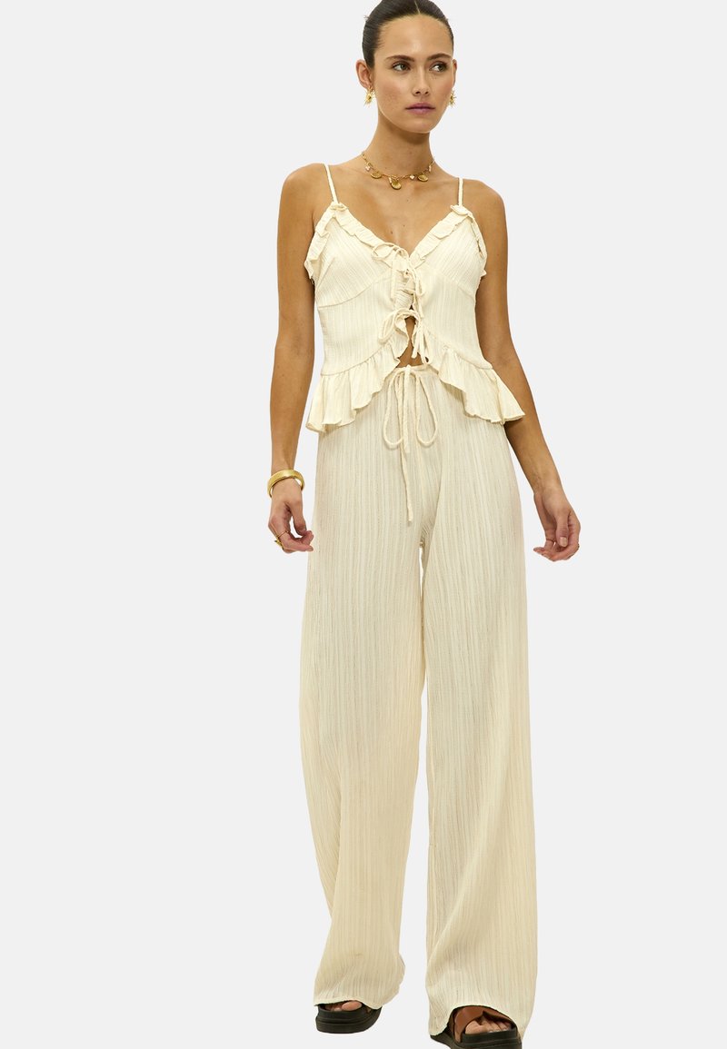Combinaison crème avec un peplum froncé, des bretelles réglables, un tissu texturé, des jambes amples et un détail de lien à l'avant.