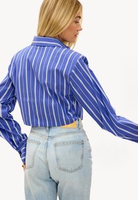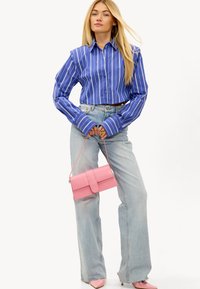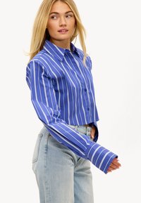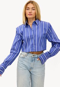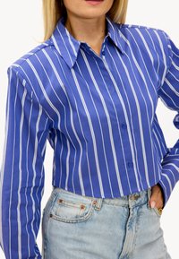 Chemise bleue coupe courte avec des rayures verticales blanches, fermeture à boutons, manches longues avec larges poignets, associée à un jean en denim bleu clair.