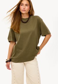 T-shirt oversize kaki en coton doux, avec un col rond, des manches courtes et un design uni sans motifs ni embellissements.
