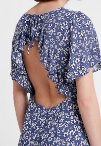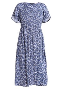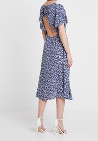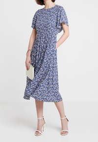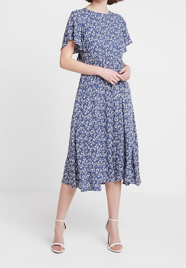 Femme portant une robe midi bleue à imprimé floral blanc, manches courtes volantées, et sandales blanches à talons hauts avec bride à la cheville.