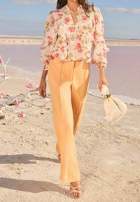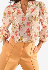 Blouse florale avec des motifs roses et jaunes, bords volants et décolleté en V, associée à un pantalon plissé de couleur pêche.