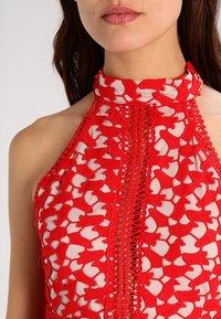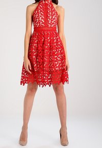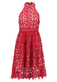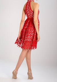 Robe rouge à bretelles avec un motif en dentelle en forme de cœur, des finitions complexes et une jupe évasée. Matériau léger avec une finition texturée.