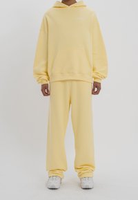 Personne portant un sweat à capuche jaune pâle et un pantalon de survêtement assorti, avec une poche avant et un logo de marque blanc discret sur la poitrine et la jambe.