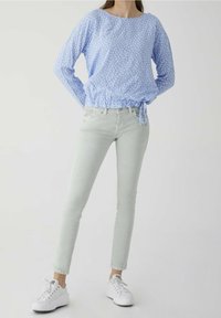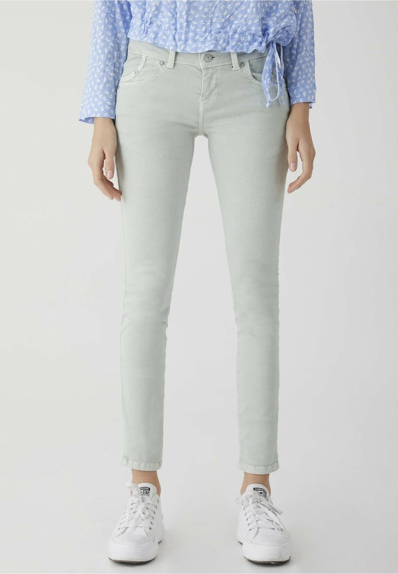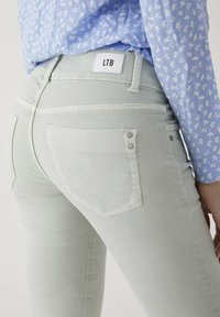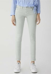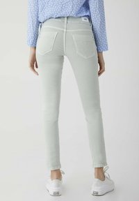 Jean skinny vert clair avec une texture lisse, design à cinq poches et taille basse, associé à des baskets blanches.