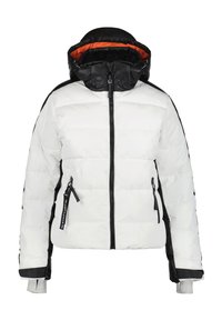 Doudoune blanche avec une capuche noire et orange, présentant des surpiqûres horizontales, des panneaux latéraux noirs et des poches zippées.