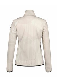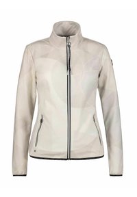 Veste zippée beige clair pour femme avec col haut, deux poches latérales zippées et détails subtils de motifs circulaires.