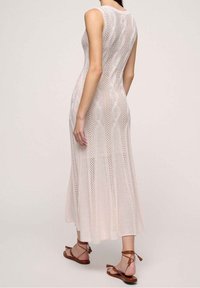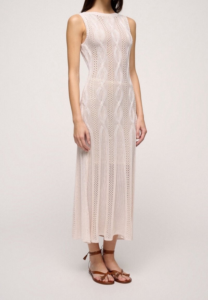 Robe blanche en maille avec une texture côtelée et un motif ajouré. Dotée d'un design sans manches et de fentes latérales. Associée à des sandales noires.