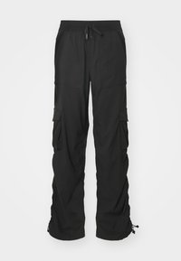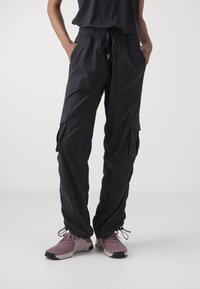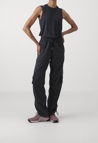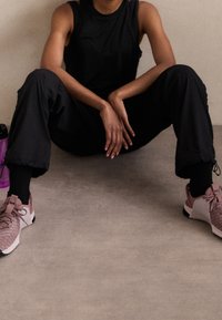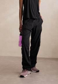 Personne portant un pantalon cargo noir et des baskets roses, tenant une bouteille d'eau violette dans une main, debout sur un fond neutre.