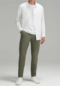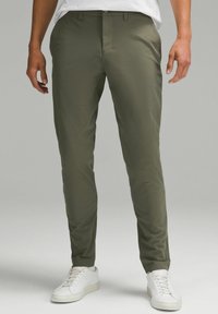 Homme portant un pantalon ajusté vert olive et des baskets blanches devant un fond gris uni.