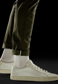 Homme portant un pantalon beige slim et des baskets blanches, debout sur un fond gris clair.