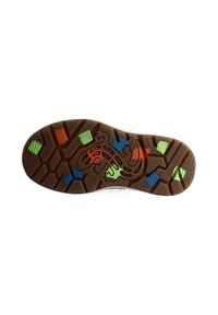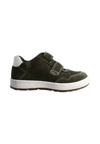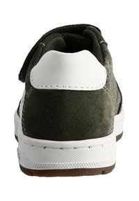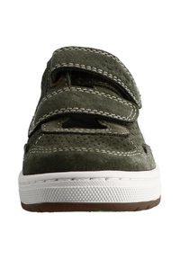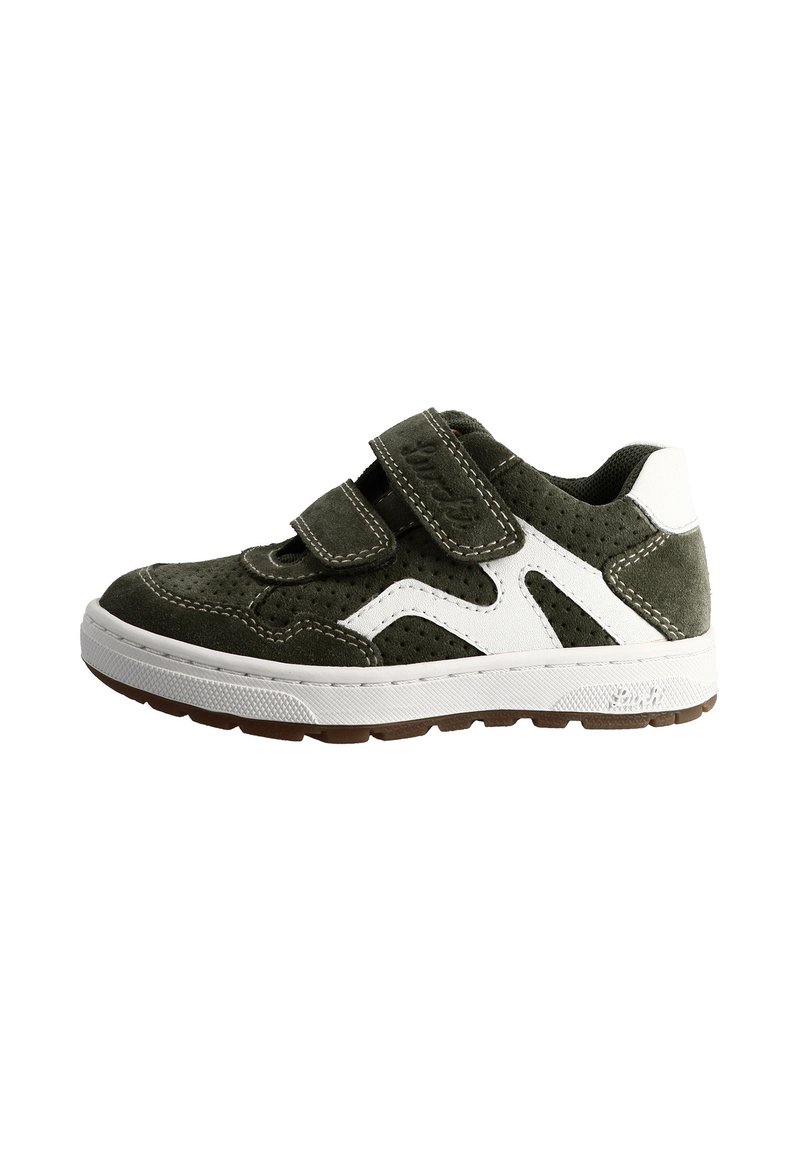 Baskets en daim vert avec accents synthétiques blancs, deux bandes auto-agrippantes, design perforé et semelle en caoutchouc texturée.