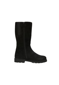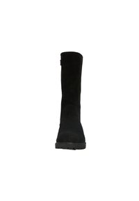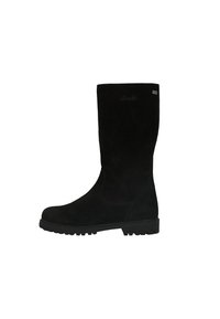 Bottes noires en daim montantes avec une finition texturée, dotées d'une semelle en caoutchouc et d'un logo en relief sur le côté, adaptées pour l'hiver.