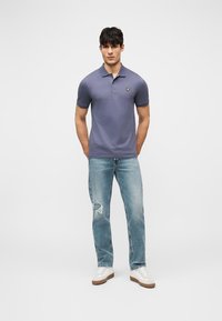Homme aux cheveux foncés portant un polo bleu ajusté avec un emblème d'oiseau jaune sur la poitrine et un jean bleu clair délavé et usé.