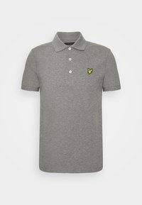 Polo gris en tissu doux avec un col classique, patte de boutonnage à trois boutons, et un logo brodé jaune sur la poitrine.
