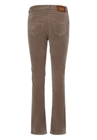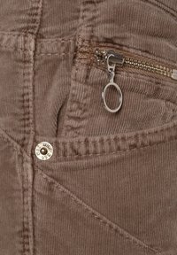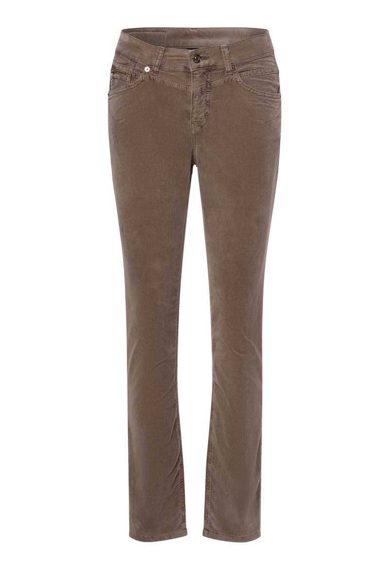 Pantalon en velours côtelé marron avec une coupe droite, muni de poches avant, d'une texture subtile et d'une fermeture par bouton à la taille.
