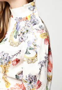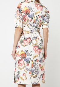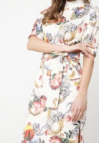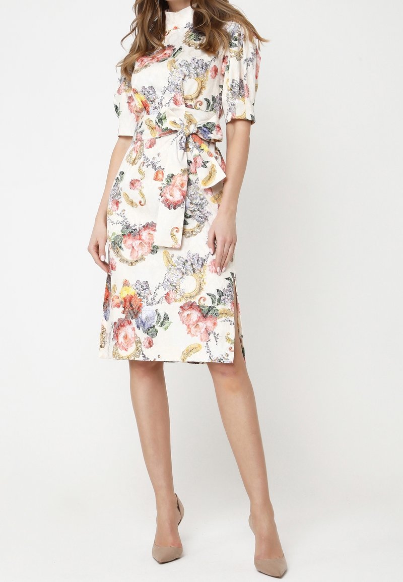 Robe fleurie avec une taille cintrée, un tissu doux, des manches courtes et un nœud décoratif. Les couleurs comprennent le rose, le violet et des accents dorés. Fentes latérales.