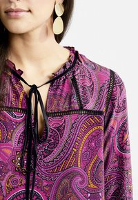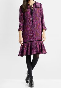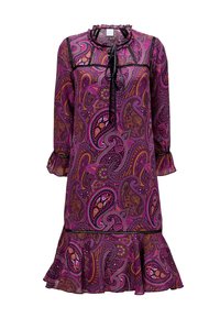 Robe à motif paisley violet avec un ourlet évasé, des manches longues et un col à nouer. Détails en noir et tissu texturé.