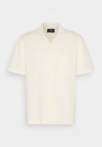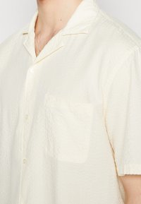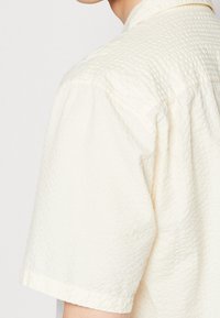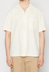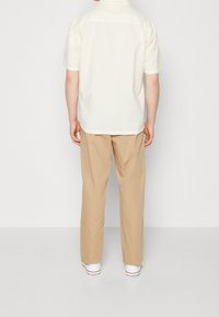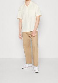Homme portant une chemise à manches courtes texturée de couleur blanc cassé avec une poche poitrine et un pantalon beige, visible des épaules aux hanches.