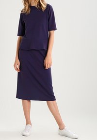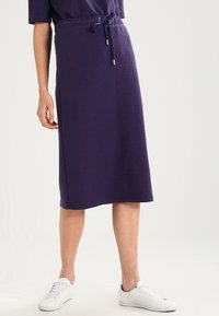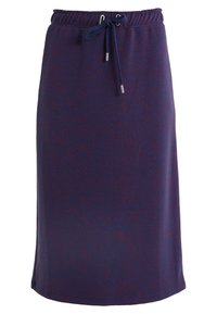 Femme portant une jupe midi bleu marine à taille coulissante, associée à des baskets blanches décontractées, debout devant un fond clair.