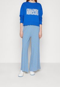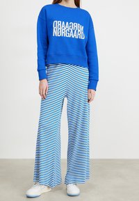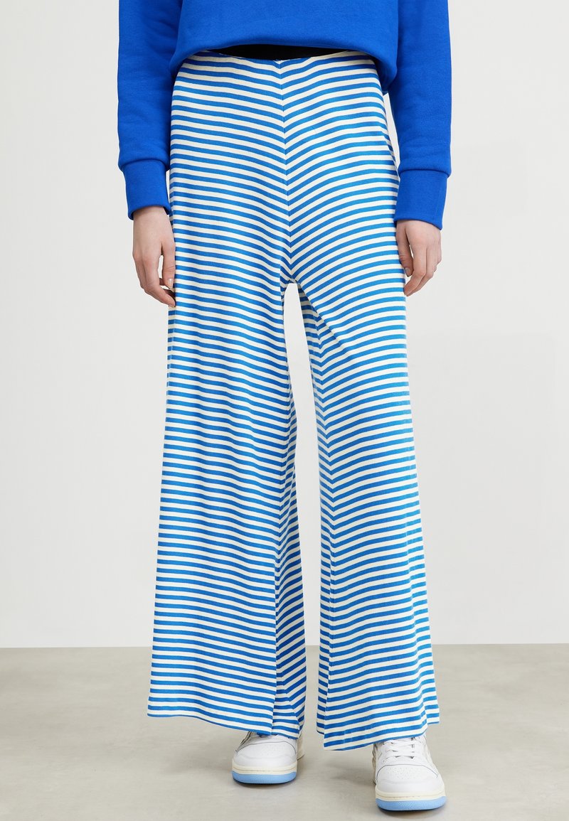 Personne portant un pantalon large à rayures horizontales bleues et blanches, un sweat-shirt bleu et des baskets blanches, debout sur un sol gris.