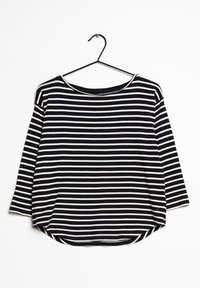Chemise à manches longues rayée noire et blanche avec un col arrondi et une coupe ample, présentant un ourlet incurvé et une texture de tissu douce.