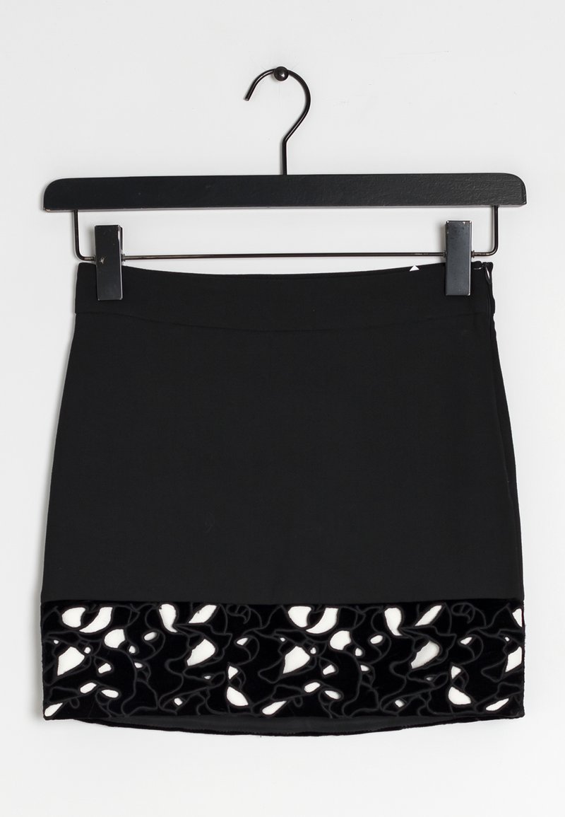 Jupe noire avec une texture lisse et une bordure en dentelle de velours blanc et noir à l'ourlet. Suspendue à un cintre en métal noir.