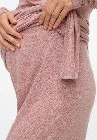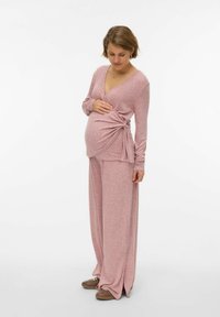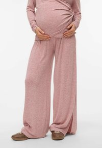 Pantalon de maternité rose clair à jambes larges, confectionné en tissu tricoté doux, avec une ceinture confortable et des fentes latérales à l'ourlet.