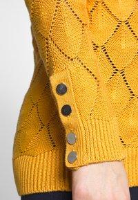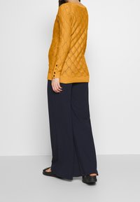 Femme portant un pull en tricot jaune moutarde avec un motif en losange et des détails de boutons sur la manche, associé à un pantalon foncé.