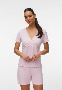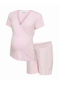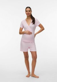 Femme enceinte portant un haut à manches courtes côtelé rose clair et un short assorti, tenant doucement son ventre, debout sur un fond blanc.
