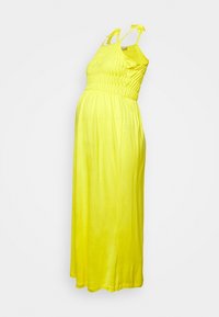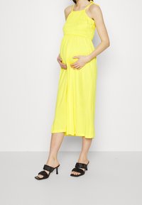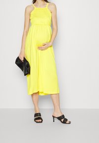 Femme enceinte en robe midi jaune sans manches tenant son ventre, portant des sandales à talons noires sur un fond uni.