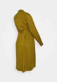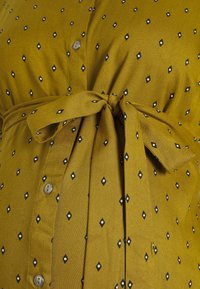 Robe de maternité à manches longues couleur jaune moutarde avec petit motif losange noir et blanc, boutons sur le devant et ceinture à nouer à la taille.