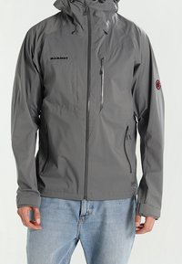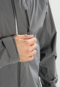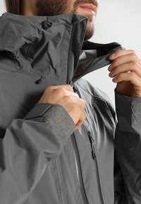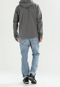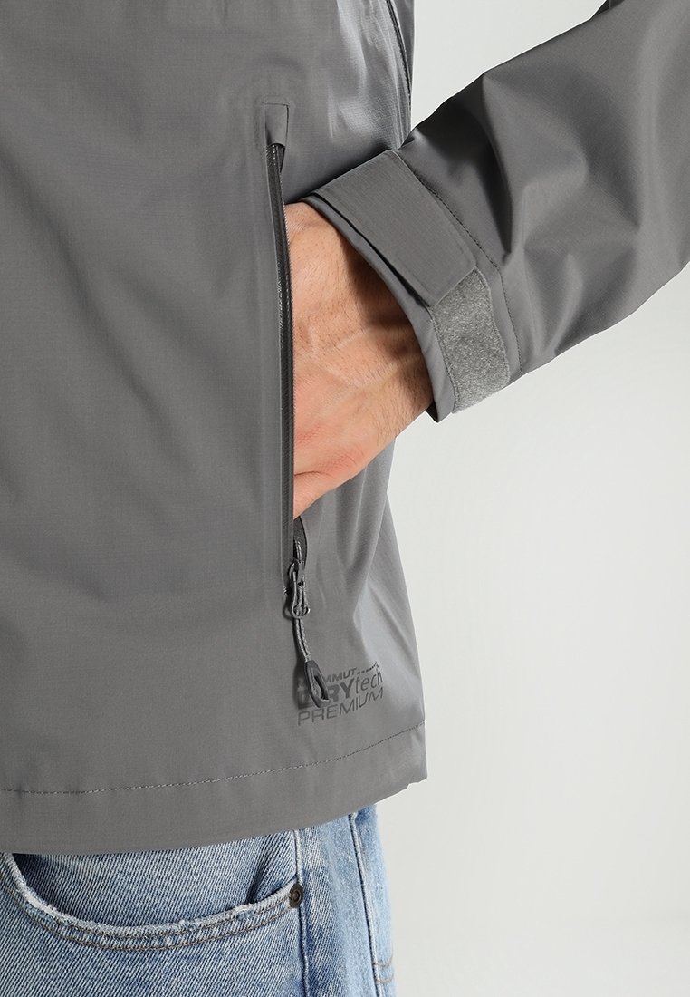 Main insérée dans la poche zippée d'une veste imperméable grise avec poignet ajustable en Velcro, au-dessus d'un jean en denim bleu sur un fond uni.