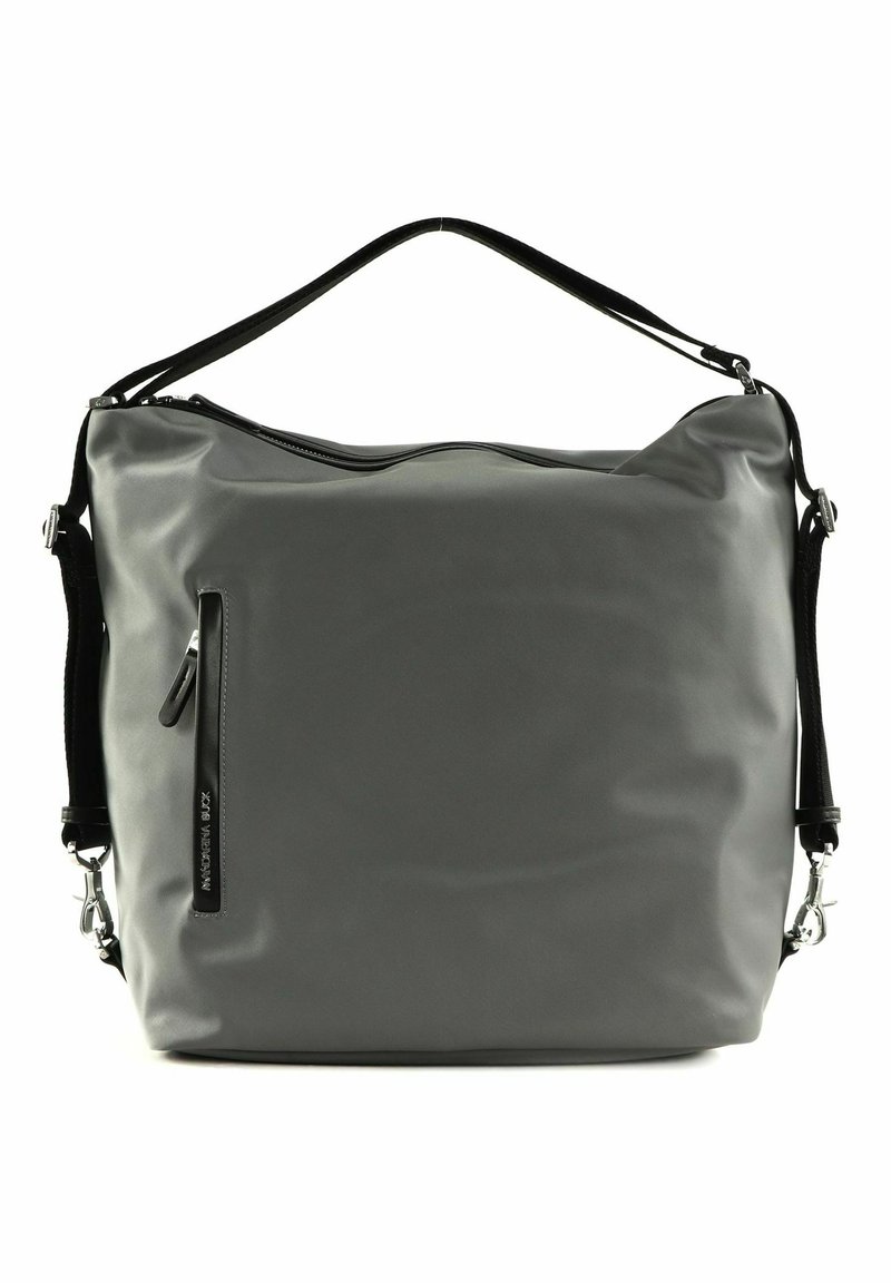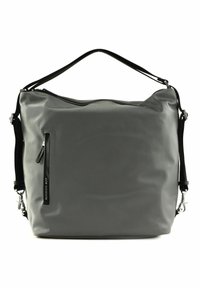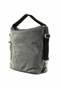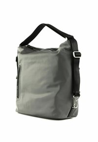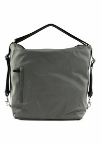 Sac à main imperméable gris avec une fermeture éclair, une bandoulière noire réglable et une poche zippée à l'avant. Caractérisé par une texture lisse et un design minimaliste.