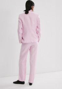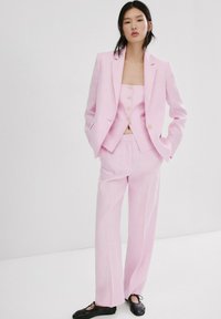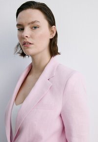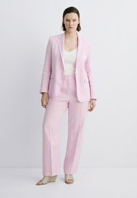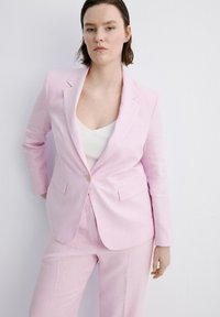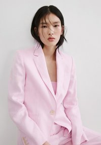 Femme debout sur un fond blanc, portant un blazer rose clair ajusté et un pantalon assorti, avec un haut blanc en dessous.