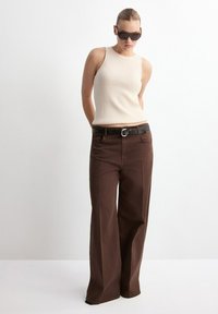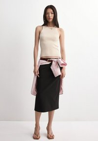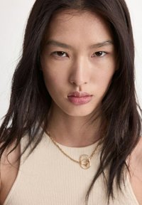 Jeune femme aux longs cheveux foncés portant un haut crème sans manches à côtes, un pull rose noué à la taille, une ceinture sombre et un collier en or avec des pendentifs circulaires.