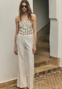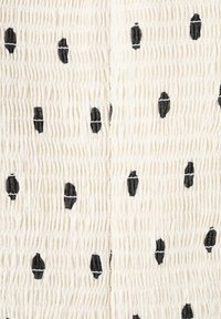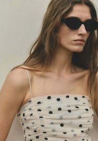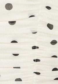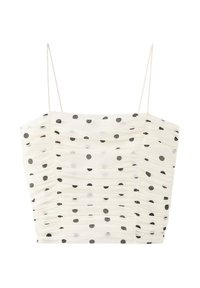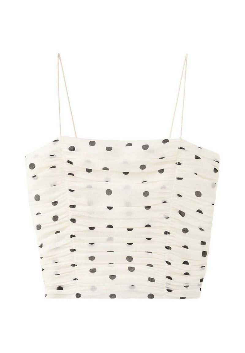 Crop top blanc froncé avec fines bretelles et motif à pois noirs répartis uniformément sur le tissu.