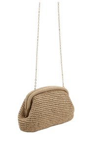 Pochette tissée beige avec un bord supérieur arrondi et un extérieur doux et texturé, présentée sur un fond blanc.