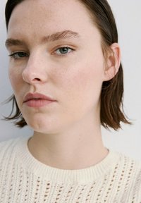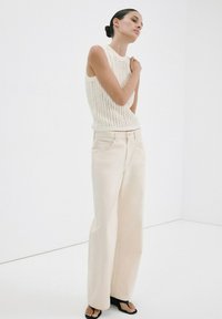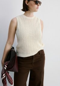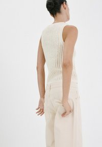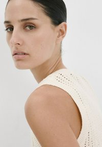 Femme portant un haut tricoté sans manches blanc et un pantalon beige clair, posant avec un bras levé devant un fond blanc.
