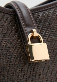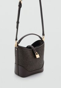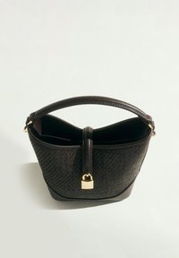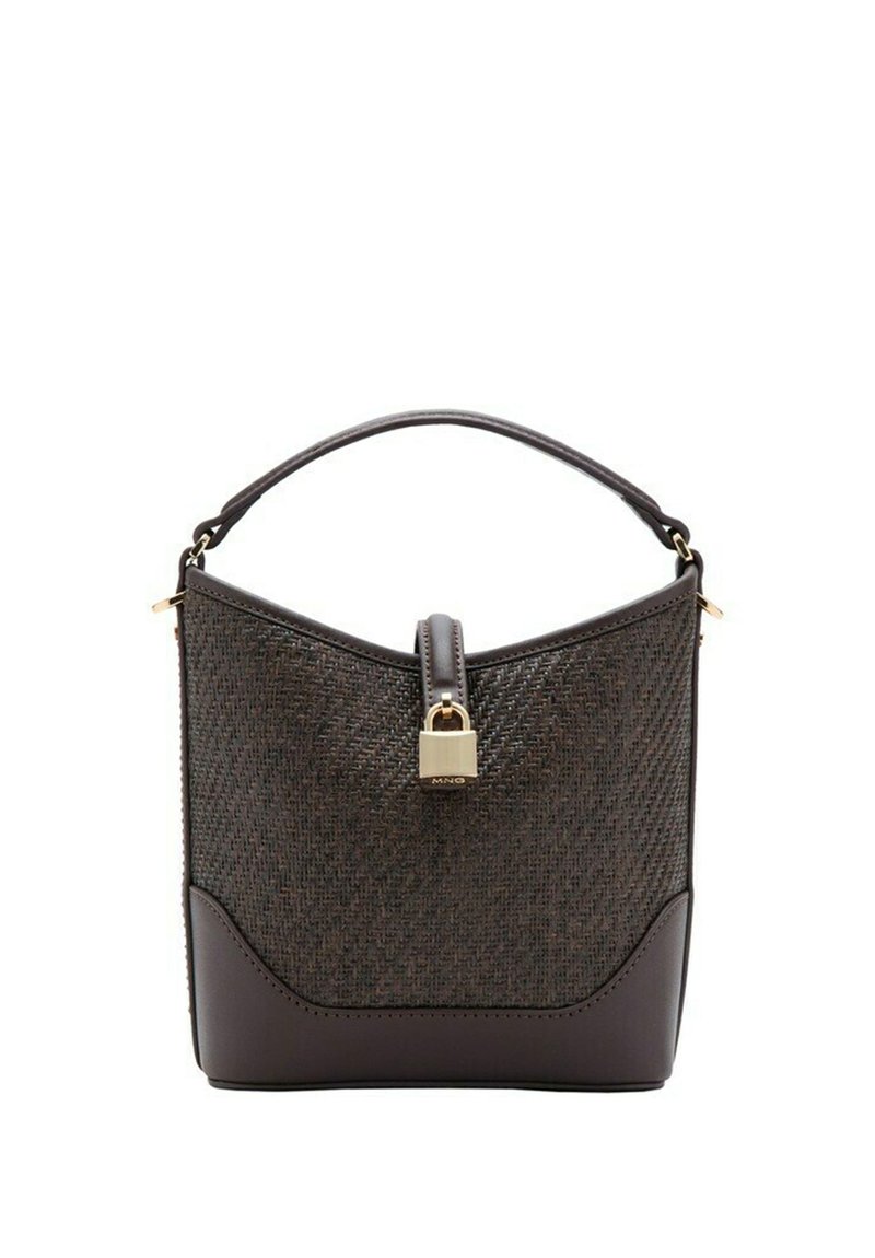 Sac à main en cuir marron et paille tressée avec poignée courte et détail de cadenas doré sur la sangle avant.