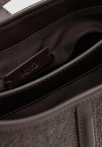 Sac fourre-tout tissé marron foncé avec de larges bandoulières en cuir et un détail de boucle dorée sur une bandoulière.