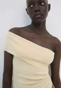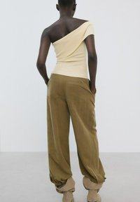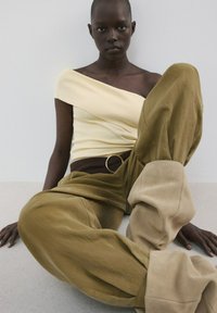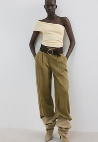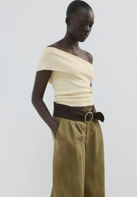 Femme portant un haut jaune pâle à épaules dénudées et un pantalon olive taille haute avec une large ceinture noire, debout les mains dans les poches.