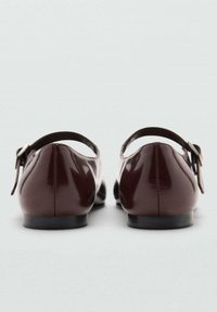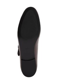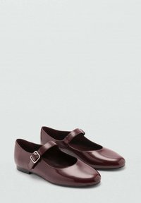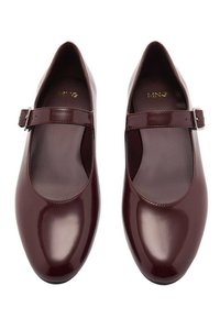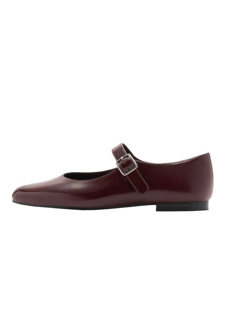 Chaussure Mary Jane en cuir verni bordeaux avec un bout pointu, une semelle plate et une bride réglable à boucle. Texture lisse avec un minimum de détails.
